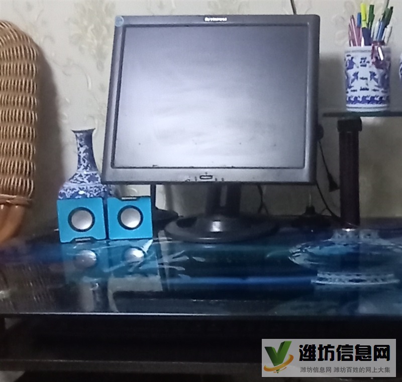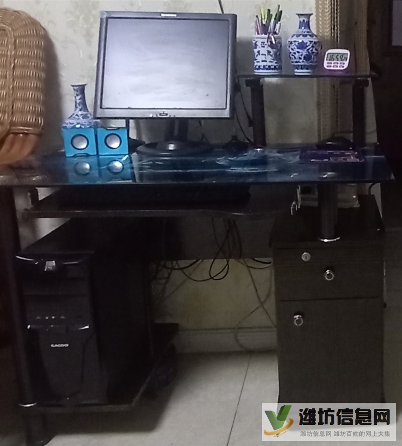 臺(tái)式電腦機(jī)全套,包括主機(jī),顯示屏,擴(kuò)音器,視頻器,話筒。電腦桌。